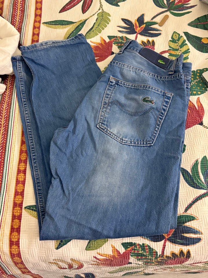 Lacoste markalı, mavi renkte bol kesim, fermuarlı kot pantolon. Günlük kullanıma uygun, rahat ve şık sokak stili için ideal.