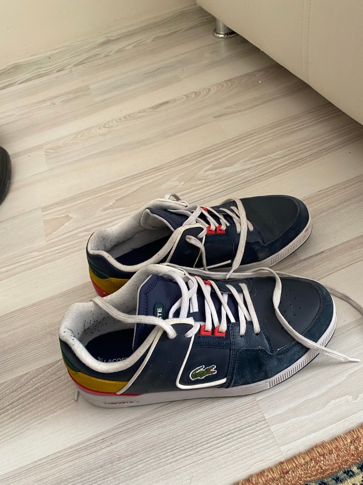 Lacoste'un koyu mavi erkek spor ayakkabısı, baskılı desen ve velcro bantlı kauçuk tabanla spor ve sokak tarzı için uygundur.