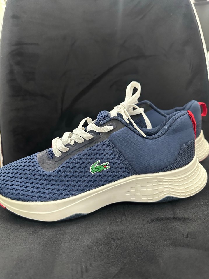 Renkli mavi file üst yüzey, beyaz bağcıklar ve kauçuk tabanlı erkek spor ayakkabı. Lacoste logosu ile trend sokak stili için uygun. 2 adet 41 1adet 40 1 adet 43 1 adet 44