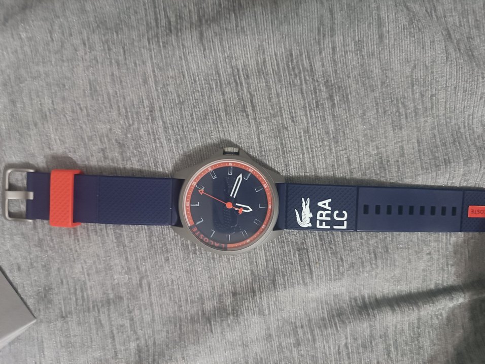 Lacoste erkek saatte mavi dokulu kayış ve kırmızı detaylı gri kadran bulunur, sokak tarzı için uygun spor tasarım sunar. ⌚ temiz kutulu fatura kağıdı mevcut