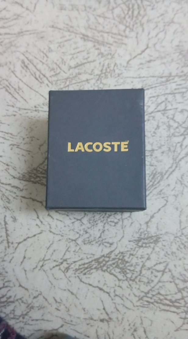 Lacoste markalı, altın renkli yazılı gri erkek saat kutusu. Paris tarzı normcore şıklığı yansıtıyor.