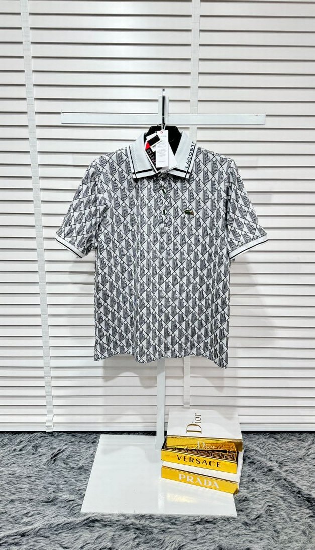 Lacoste markalı, gri desenli, kısa kollu, yakalı ve düğmeli önü olan bol kesim polo tişört. Sentetik kumaştan, rahat sokak stili için uygun.