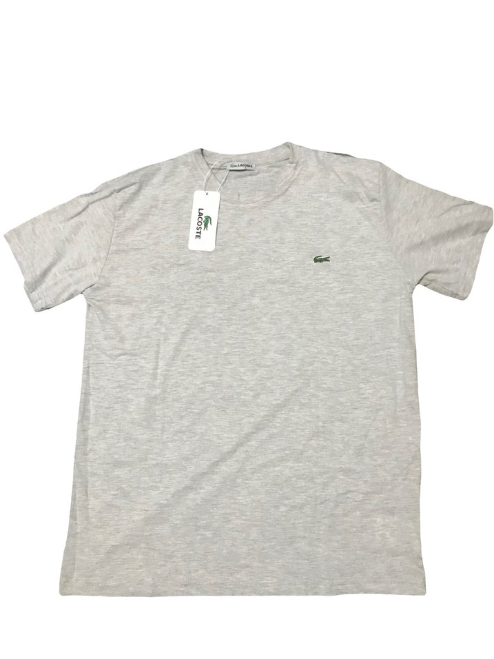Lacoste marka, gri renk, kısa kollu ve bisiklet yaka erkek tişört. Keten kumaştan, rahat kesim ve desensiz tasarıma sahip, günlük sokak stili için uygun.