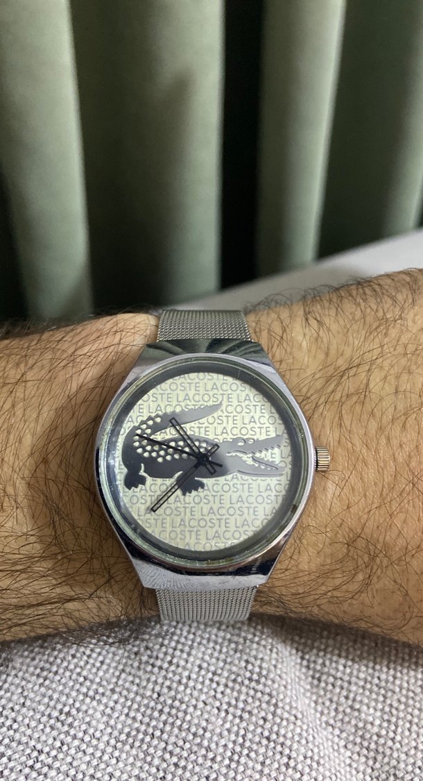 Gri renkli Lacoste erkek kol saati, vintage tarzda, file kayış ve detaylı logo desenli kadran ile. Pil değişimi gerekli tertemiz kullanılmadığından satıyorum