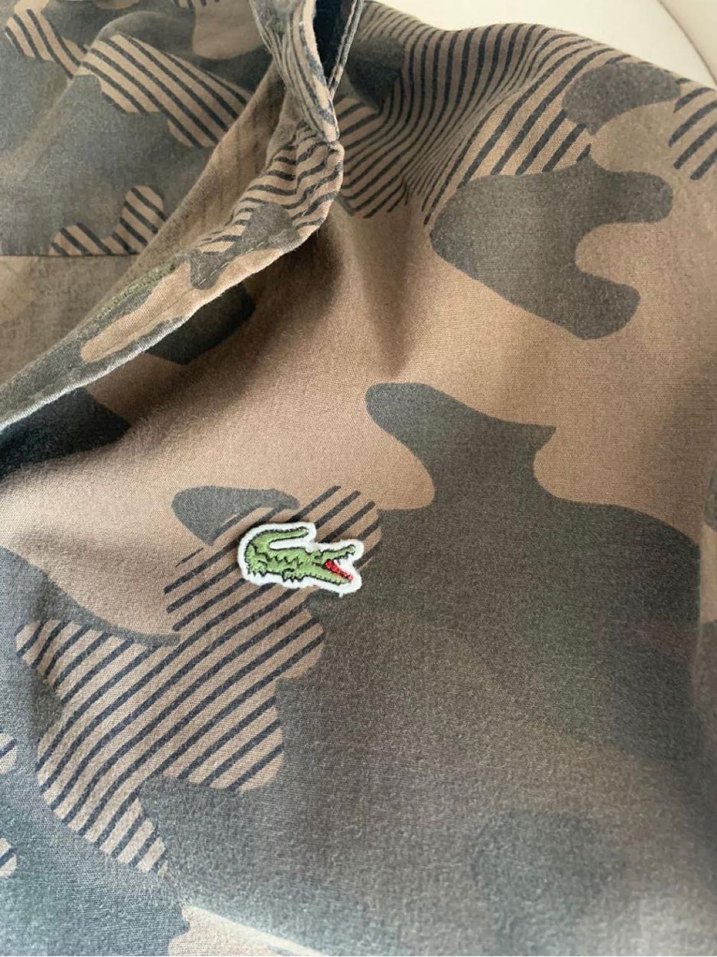 Lacoste haki tonlarda kamuflaj desenli, düğmeli, uzun kollu, slim fit ünisex gömlek. Sentetik kumaştan, notched lapel yakalı, günlük ve sokak stiline uygun.