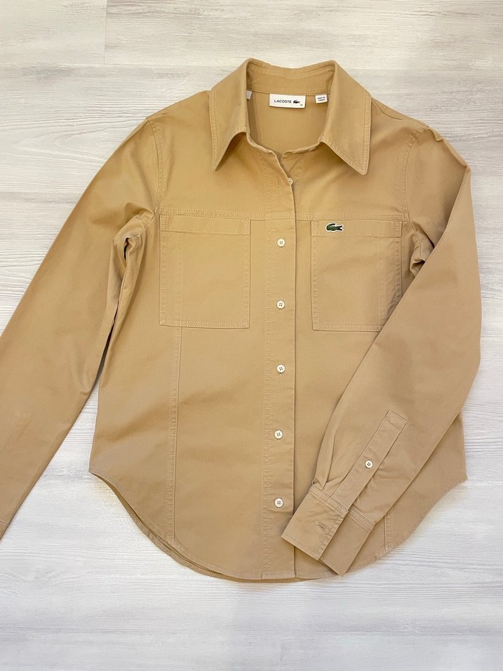 Lacoste Kadın Gömlek, Orjinaldir, Temiz ve az kullanışmıştır, Herhangi bir deformasyon yoktur, Kalın ve tok bir kumaşı vardır, S - 36 beden, Ölçüleri: en 48cm, boy 64cm, Camel renk