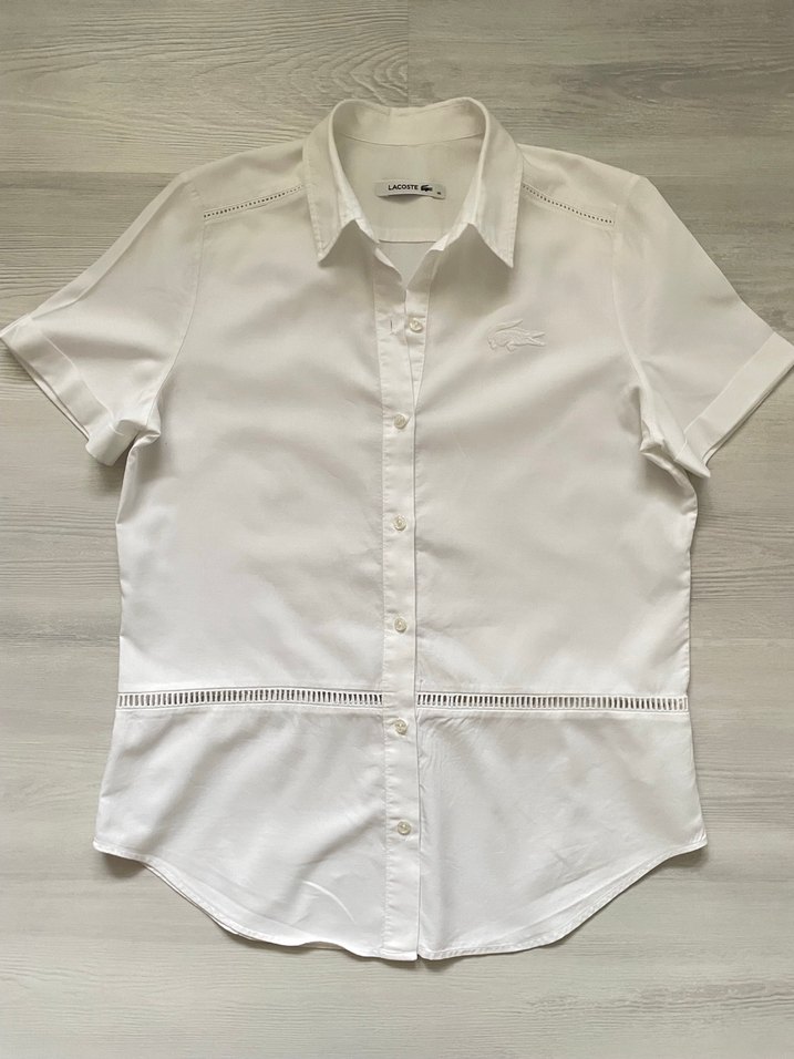 Lacoste Kadın Gömlek, Orjinaldir, Temiz ve az kullanışmıştır, Herhangi bir deformasyon yoktur, Dokulu tok bir kumaşı vardır, S - 36 beden, Ölçüleri: en 48cm, boy 65cm, Detaylı iç etiket fotoğraflarda mevcut, Beyaz renk, Kısa kol, Fisto detaylı