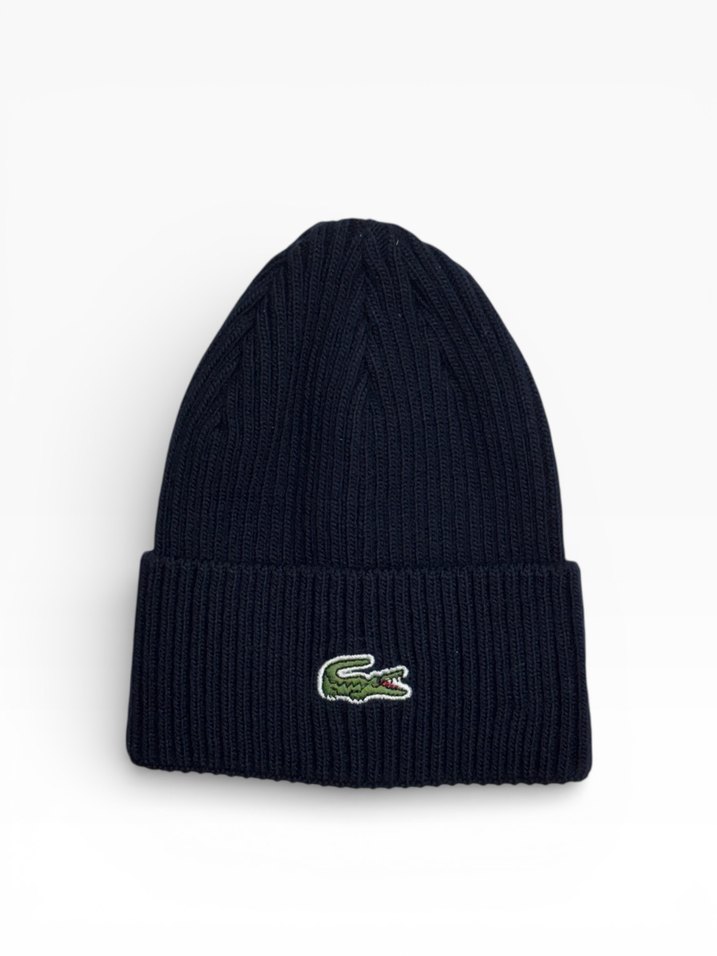 Lacivert örgü kumaştan, katlı manşetli ve Lacoste logosu bulunan kadın bere. Rahat ve şık sokak stili için uygundur.