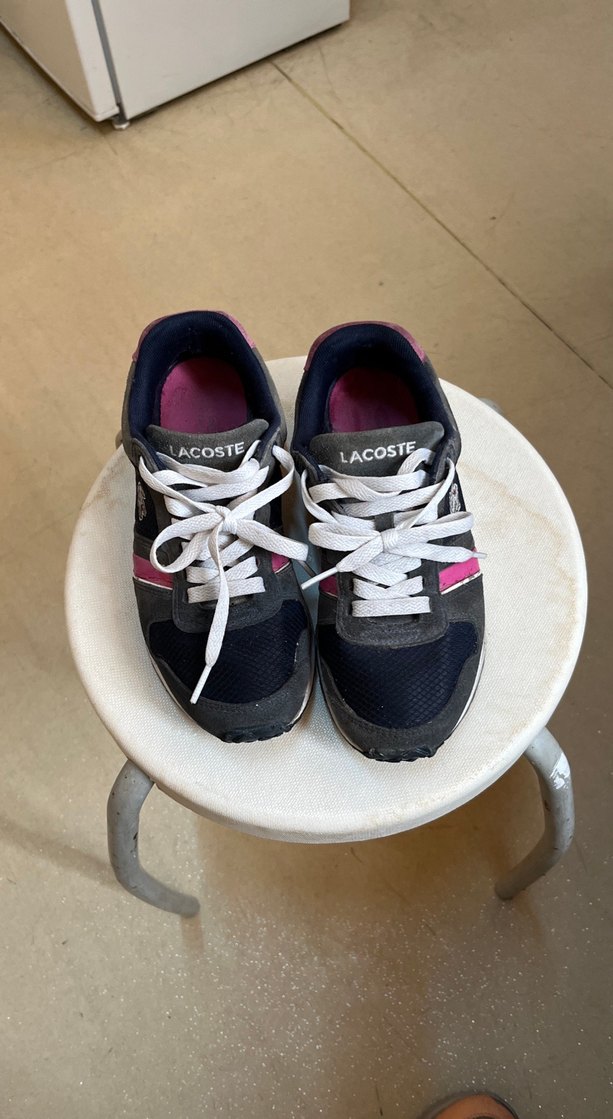 Lacoste marka, pembe ve siyah renkli, şerit desenli, bağcıklı kadın spor ayakkabısı. Düz tabanlı ve kauçuk malzemeden üretilmiştir. Yanlış deterjan seçimi dolayısıyla rengi solmuş