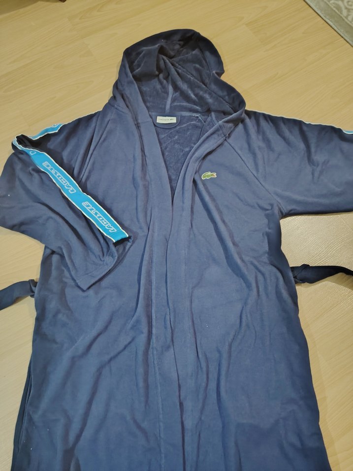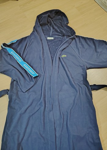 Lacoste marka, kapüşonlu ve kuşaklı lacivert bornoz, kollarında markalı şerit detaylarıyla... Pamuklu, İnce, dökümlü ve şık bir tasarımı var. Ürün orjinaldir. Kendi orjinal kemeri yok, yerine başka bornoza ait kemer takılmıştır. Bundan dolayı uygun fiyat yazılmıştır. #lacoste #hugoboss #tommy #kenzo #hugo #boss