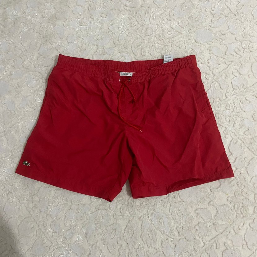 Lacoste marka, kırmızı renkli, kısa ve bol kesim erkek deniz şortu. Parlak yüzeyiyle plajda ve günlük spor giyimde rahat kullanım sağlar.