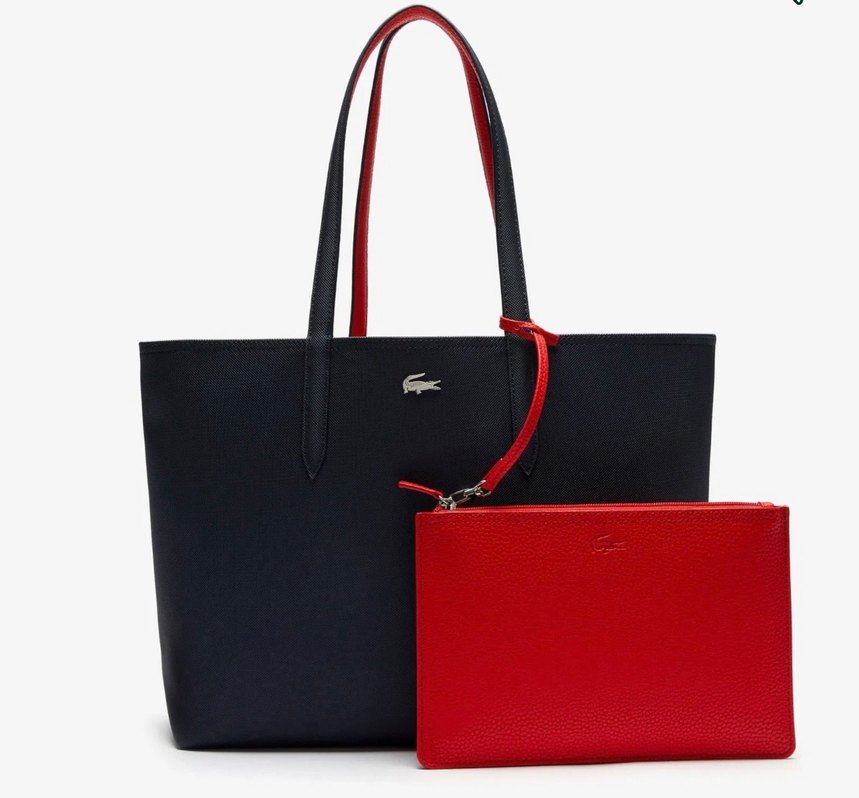 Lacoste marka, kırmızı saplı koyu deri kadın çanta ve kırmızı fermuarlı cüzdan seti. Minimalist ve çağdaş tasarıma sahip günlük kullanım için uygun.