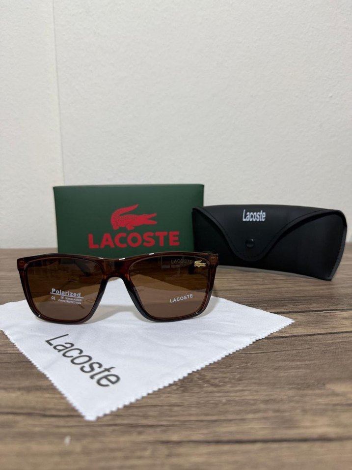 Lacoste klasik kahverengi erkek güneş gözlüğü, polarize lensli ve koruyucu kutulu, trend sokak stiline uygun. ️