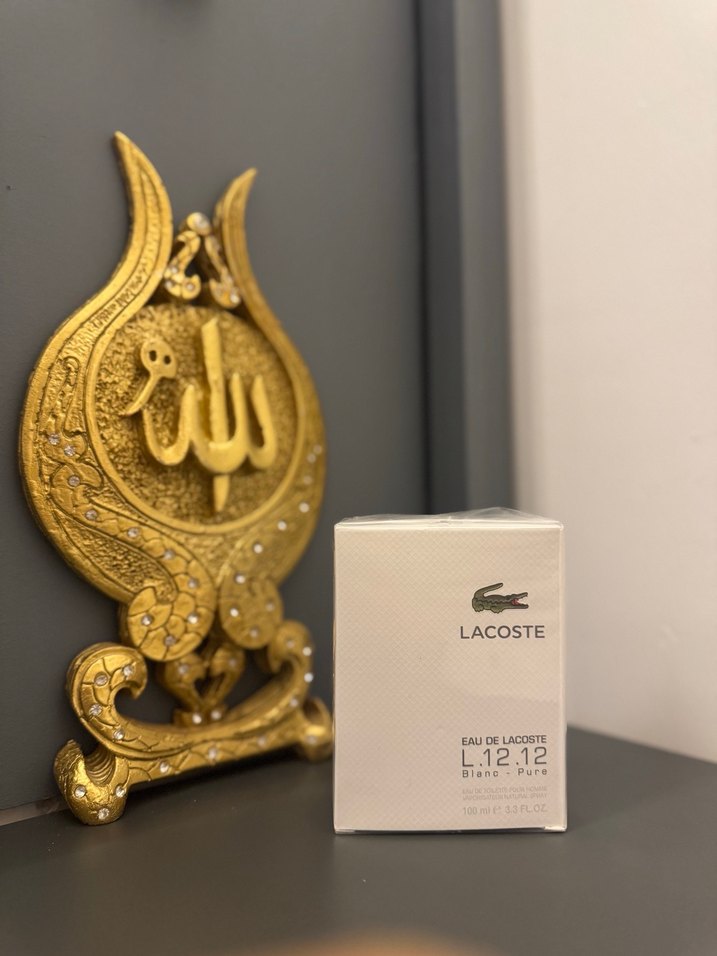Lacoste L.12.12 Blanc, modern klasik tarzda erkek parfümü, minimalist beyaz kutuda sunulur. Zarif ambalajı parlak altın arka planıyla dikkat çeker.