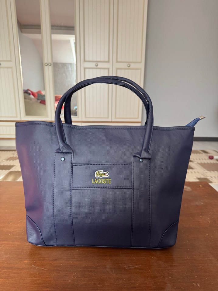 Lacoste marka, lacivert deriden yapılmış, baskılı desenli ve fermuarlı kapamalı kadın çantası. Günlük iş kullanımı için klasik ve modern tarzı bir araya getirir.