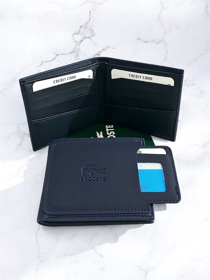 Lacoste marka lacivert erkek cüzdanı, baskılı logo ve çoklu kart bölmeleri ile sokak tarzına uygun kompakt tasarıma sahiptir.