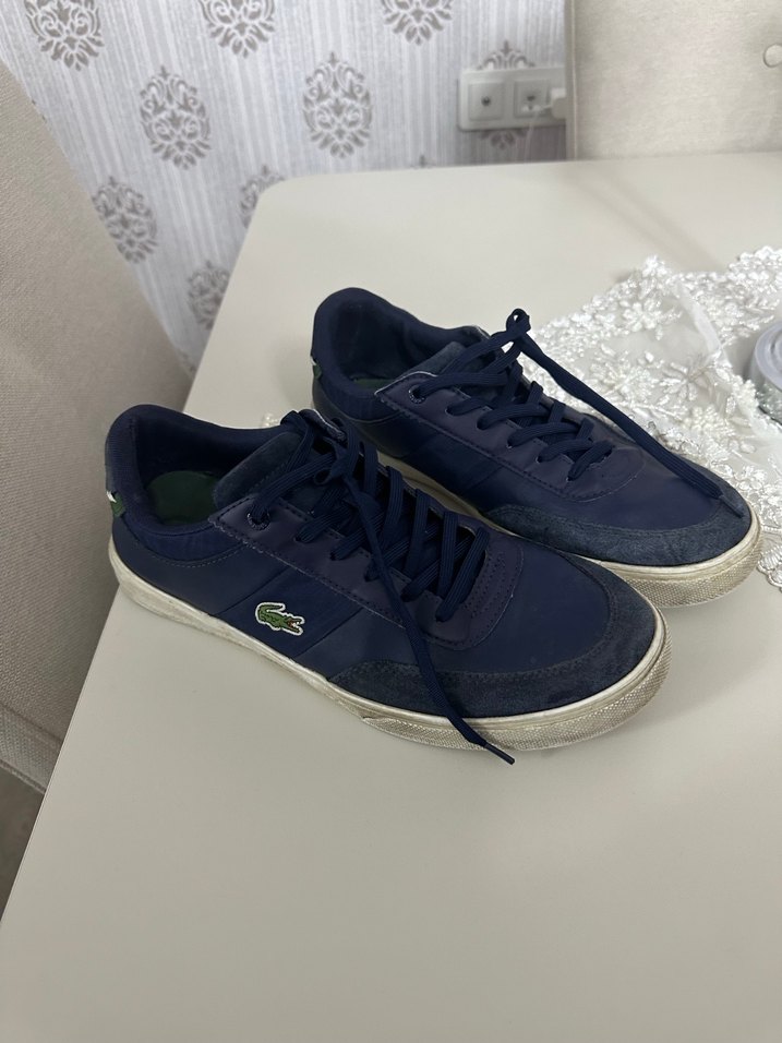 Lacivert Lacoste erkek spor ayakkabısı, bağcıklı ve düz kauçuk tabanlıdır, günlük kullanım için uygundur. Sorunsuz