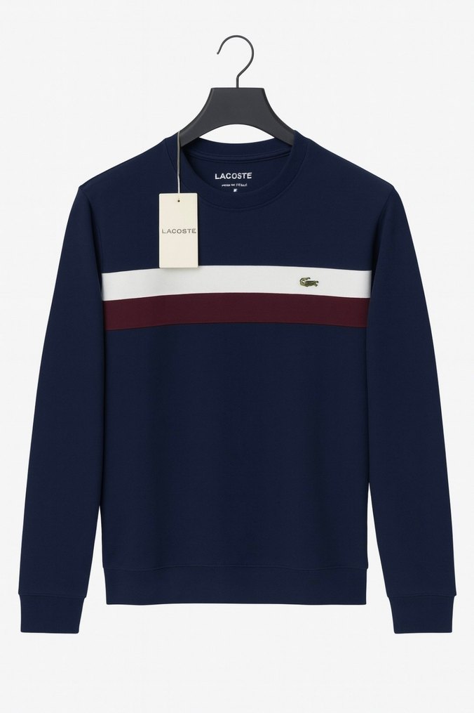 Lacivert Lacoste erkek sweatshirt, uzun kollu ve bisiklet yaka, örme kumaş ve sade renk bloklu tasarım. Rahat kalıp, günlük sokak stili için uygun.