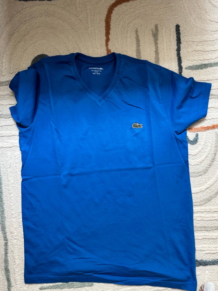 Lacoste markalı, koyu mavi renkli, V yaka ve kısa kollu. Bu da en fazla 2 kez giyilmiştir V yaka tarzım olmadığı ve üzerime çok yapıştığı için satıyorum dar kalıptır.