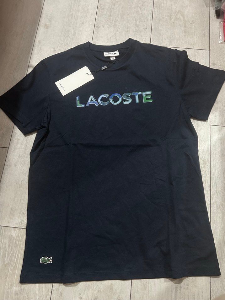 Siyah Lacoste erkek tişörtü, yuvarlak yaka ve kısa kolludur. Baskılı logo ve pamuklu kumaştan yapılmıştır, günlük kullanım için uygundur.
