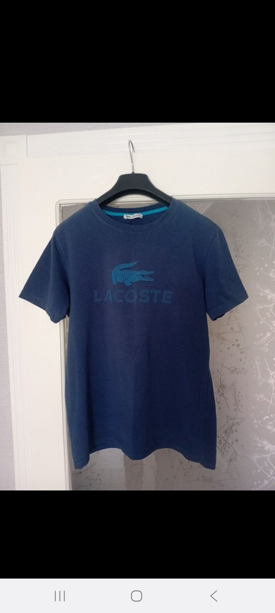 Koyu mavi denim kumaştan, kısa kollu, yuvarlak yaka ve bol kesim Lacoste erkek tişörtü. Üzerinde baskılı logo bulunur, az kullanılmış yırtlık vs. yoktur.