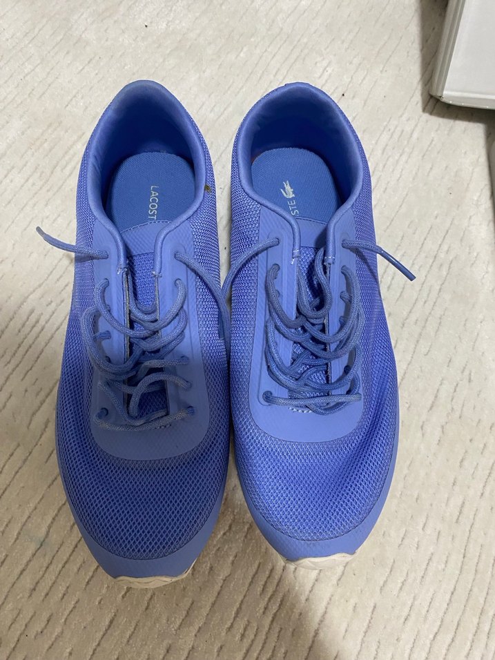 Lacoste marka, pastel mavi renkli, bağcıklı ve düz tabanlı kadın spor ayakkabısı. Spor ve sokak stiline uygun. Bi iki kez giyildi