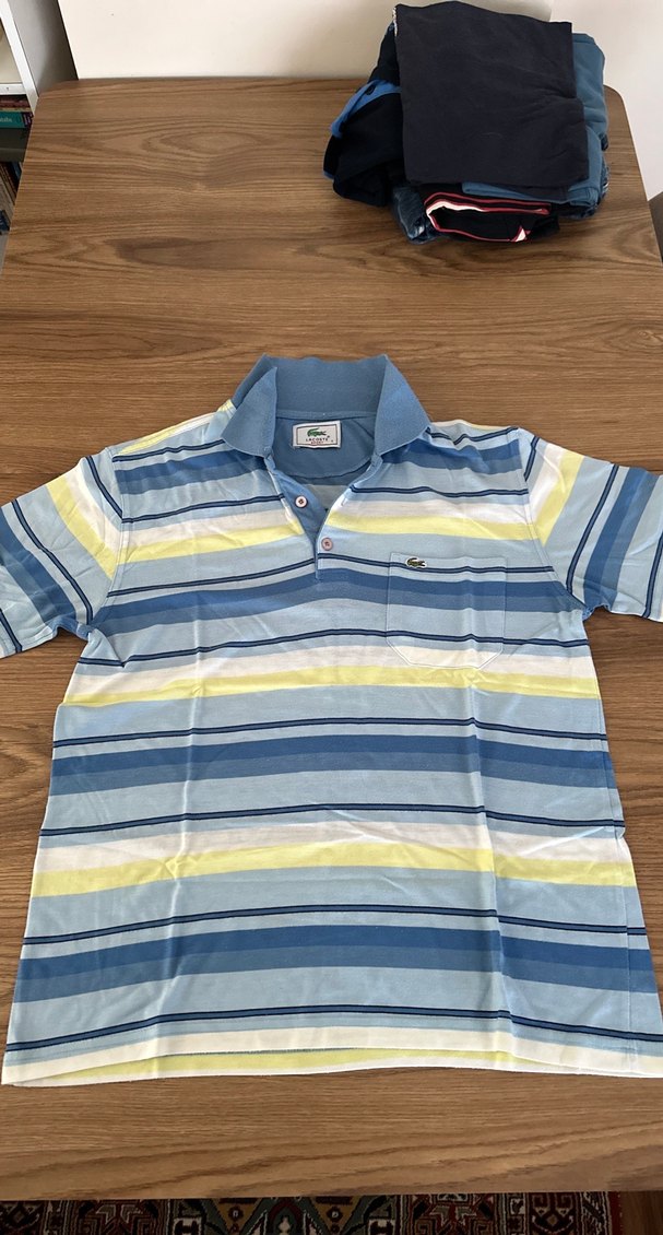 Lacoste marka, kısa kollu, yakalı ve düğmeli plaketli polo tişört. Pamuklu, mavi ve sarı pastel çizgili, bol kesim, günlük rahat kullanım için uygundur.