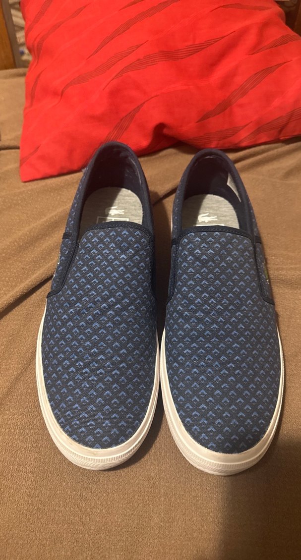 Mavi erkek espadril, kaydırmaz kauçuk taban ve lastikli rahat sokak stili için uygundur. Mavi ince desenli ve günlük kullanıma uygun. Lacoste çok az kullanılmış