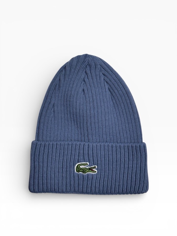 Lacoste markalı, mavi renkli örgü kadın bere, yumuşak ve sıcak tutan kumaşıyla rahat ve şık bir sokak tarzı sunar.