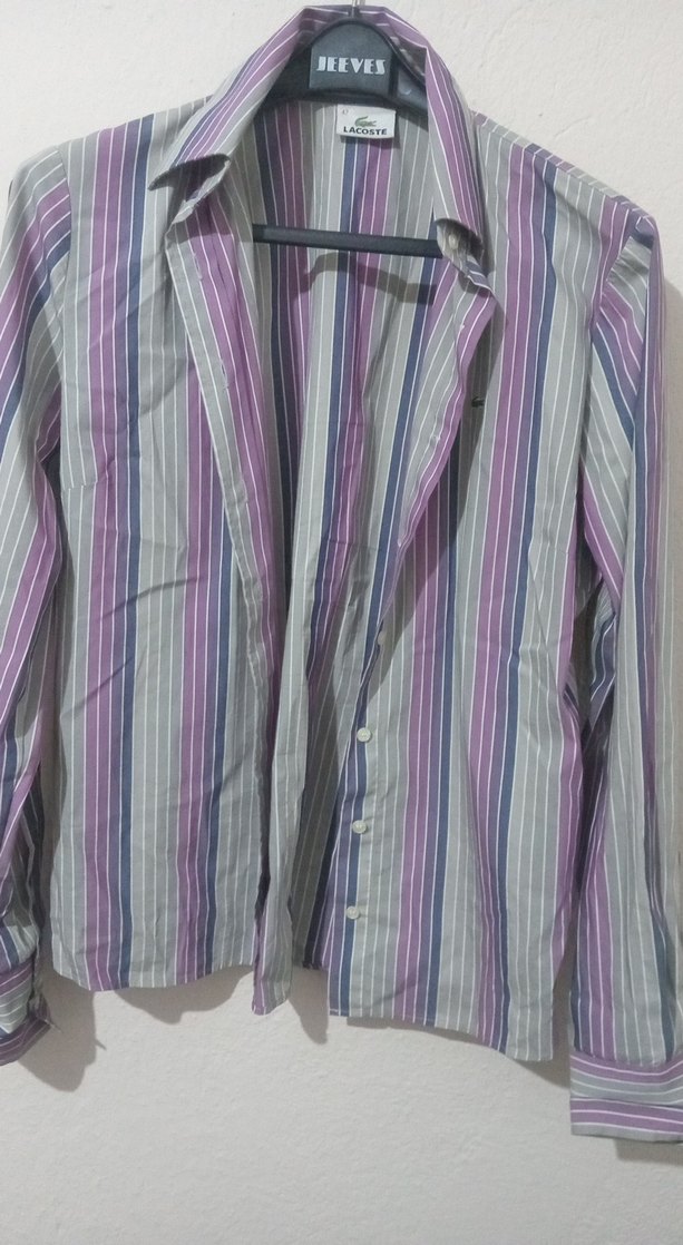 Mor pastel çizgili, uzun kollu, yakalı ve düğmeli kadın gömleği. Normal boy ve rahat kesim, ofis ve günlük sokak stili için uygunorjinal urun.kumasi yumusacik.ywni gibi.