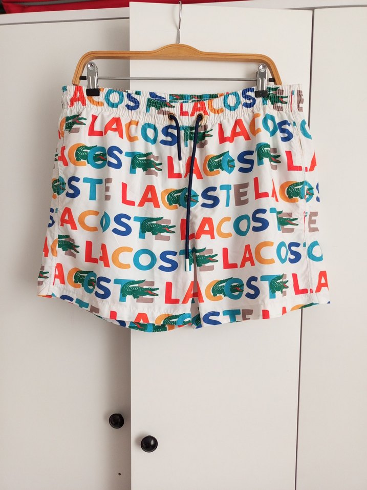 Rahat kesim, renkli Lacoste baskılı mini deniz şortu, plaj ve günlük sokak giyimi için uygundur.