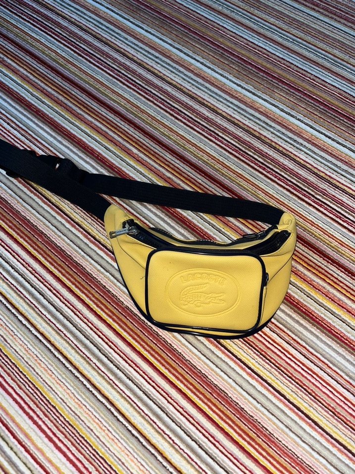 Sarı deri bel çantası, baskılı logo ve siyah detaylarla, günlük kullanıma ve rahat sokak stiline uygun.