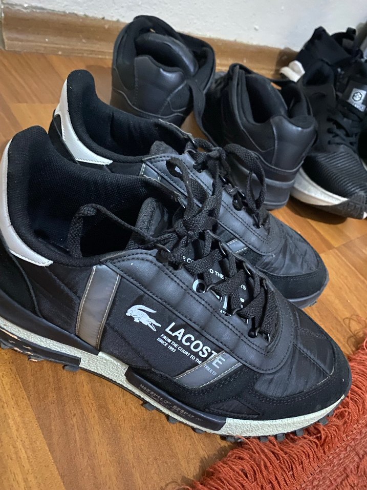 Lacoste marka siyah bağcıklı erkek spor ayakkabısı, baskılı detaylar ve kauçuk tabanla sportif sokak stili için uygun.