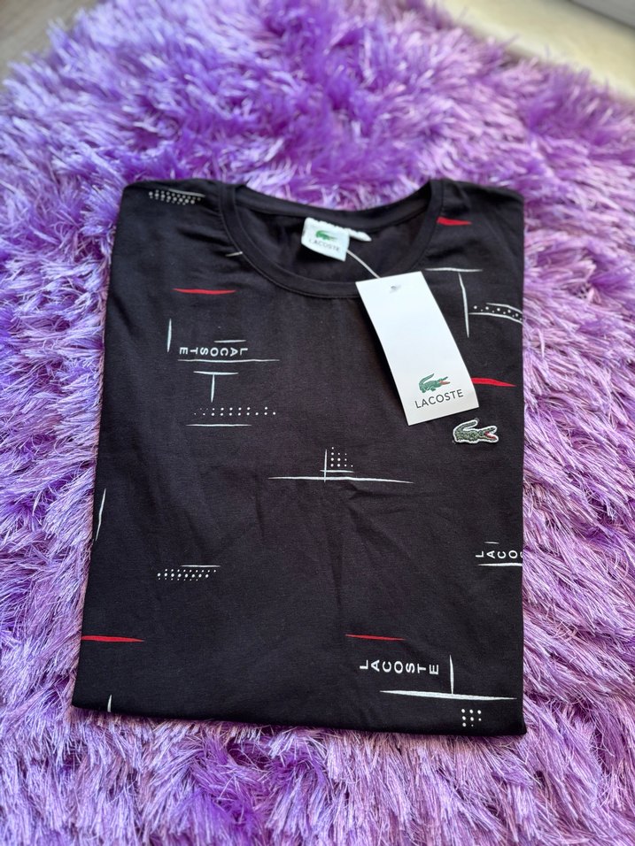Lacoste siyah baskılı erkek tişört, kısa kollu ve bisiklet yaka. Sentetik örgü kumaştan, regular fit ve günlük kullanım için uygundur.