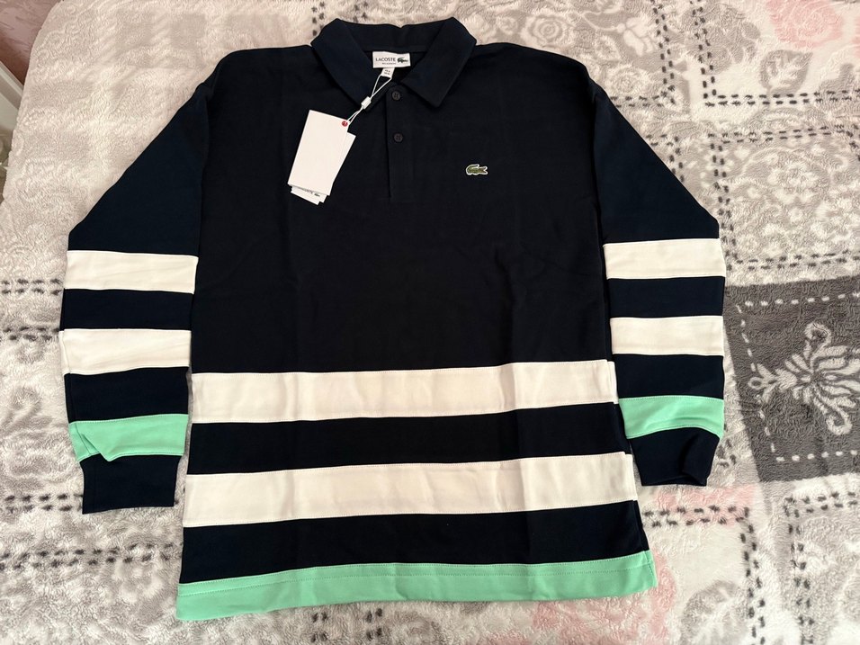 Lacoste erkek uzun kollu polo tişört, pamuklu ve rahat kesimlidir. Siyah, beyaz ve yeşil çizgilerle desenlidir, düğmeli ve yakalıdır.
