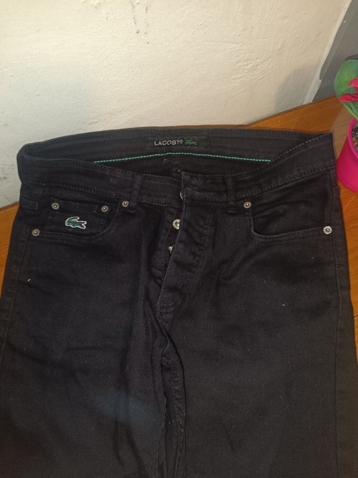 Düğmeli ön kısmı ve sade tasarımıyla Lacoste marka siyah kot pantolon, günlük sokak stiline uygun dar kesimdir.