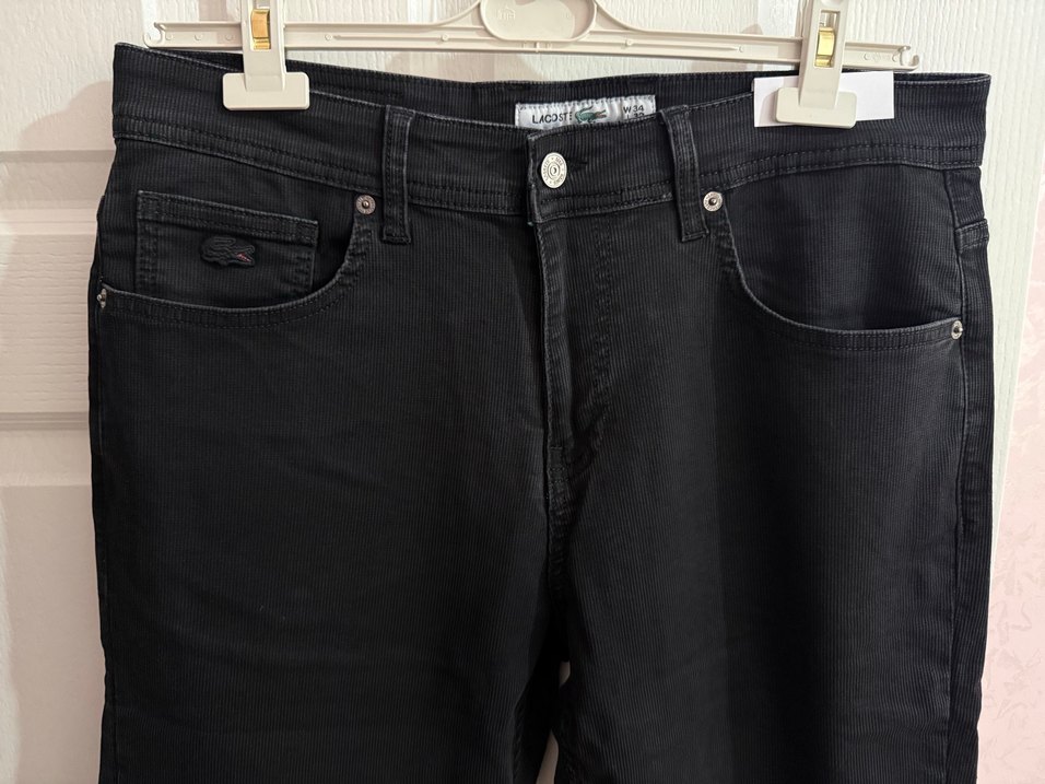 Lacoste marka siyah düğmeli, regular fit denim kot pantolon. Midi boy, desen içermeyen sade tasarım, günlük ve sokak modası için uygundur.