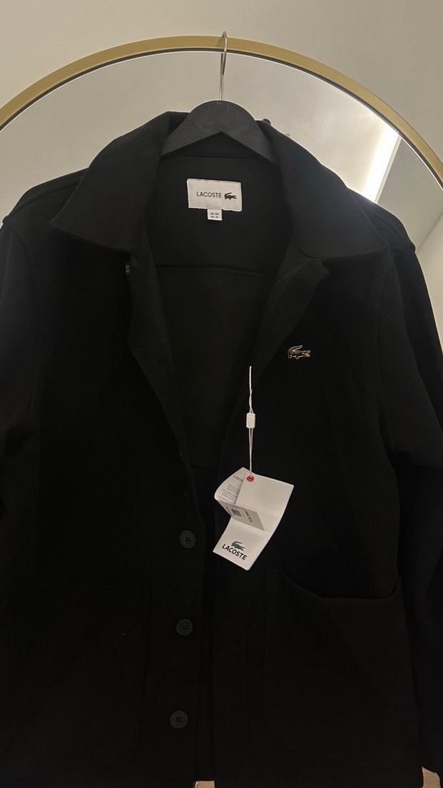 Lacoste siyah erkek ceketi, göğüs kısmında zarif logo rozeti ile şık bir tasarıma sahip.