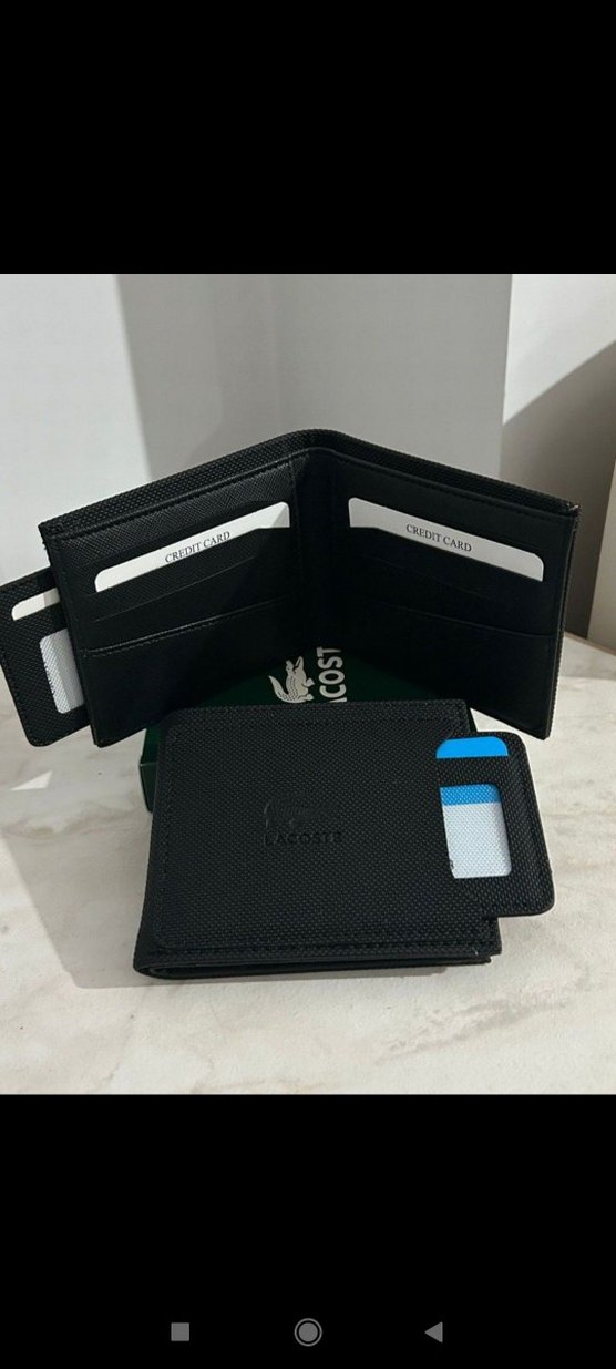 Lacoste marka, çoklu kart bölmeli, baskılı dokulu siyah erkek cüzdanı, streetwear tarzına uygun.