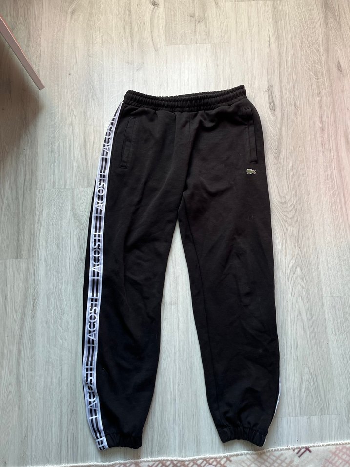 Siyah renkli, elastik bel ve paça detaylı Lacoste marka erkek jogger eşofman altı. Rahat bol kesim, spor ve günlük kullanım için uygundur.