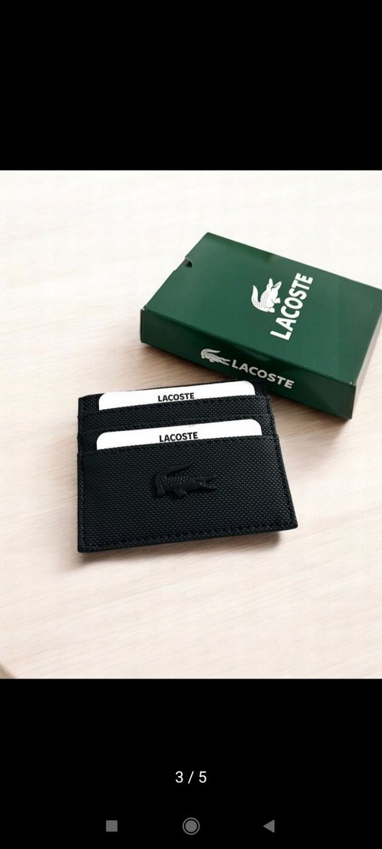 Siyah renkte Lacoste erkek kartlık cüzdan, dokulu yüzeye ve önünde markanın timsah logosuna sahiptir. Birden fazla kart bölmesi ve yeşil Lacoste kutusu ile birlikte gelir.