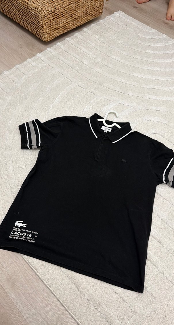 Lacoste'un siyah renkte, kısa kollu, yakalı ve baskılı detaylı pamuk erkek polo tişörtü, rahat ve şık bir günlük stil sunar.