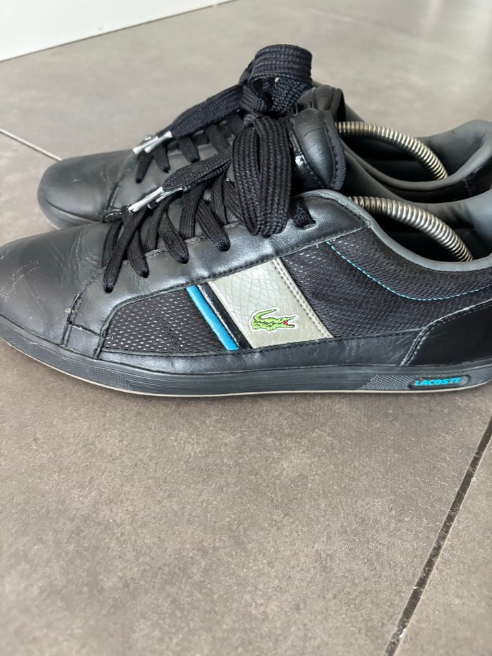 Lacoste markalı siyah erkek spor ayakkabısı, cırt cırt ve bağcıklı, kauçuk tabanlı ve logo detaylı. Spor ve sokak stiline uygun.