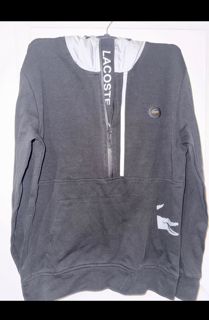 Siyah renkli Lacoste erkek sweatshirt, fermuarlı ön cep ve uzun kolludur. Rahat kesim ve yumuşak kumaştan üretilmiştir, günlük kullanıma uygundur.
