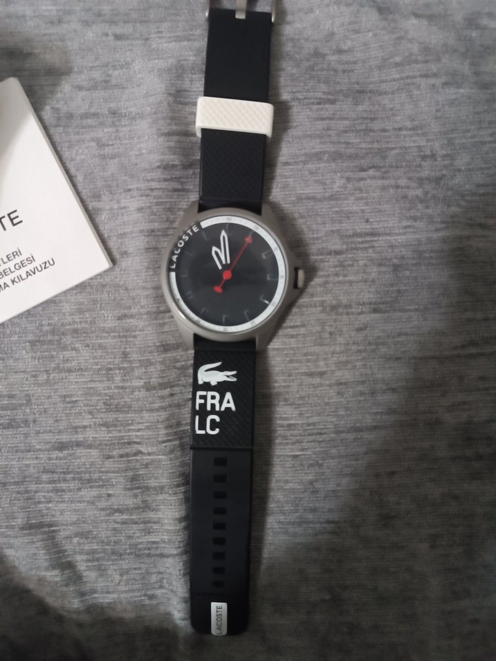 Lacoste'un siyah ve gri renkli erkek spor kol saati, minimal yuvarlak kadran ve marka logolu siyah kayış ile athleisure ve streetwear tarzına uygundur. ⌚ kutulu fatura kağıdı mevcut temiz