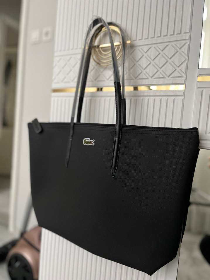 Siyah renkli su geçirmez çanta, parlak yüzey ve fermuarlı kapanışa sahiptir. Modern klasik tarzı günlük kullanıma uygundur. 30*45 CM ölçülere sahiptir.