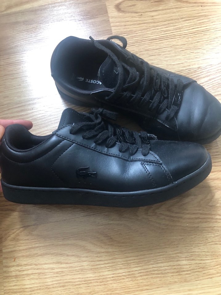 Siyah Lacoste kadın spor ayakkabısı, düz kauçuk tabanlı ve bağcıklı tasarıma sahip, sportif ve günlük kullanıma uygun.tertemiz kullanıldı orijinal üründür