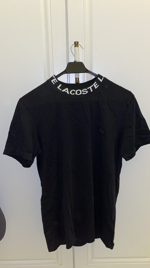 Kısa kollu, bisiklet yaka, Lacoste baskılı yaka detaylı siyah erkek tişörtü. Sentetik kumaştan, günlük kullanıma uygun.
