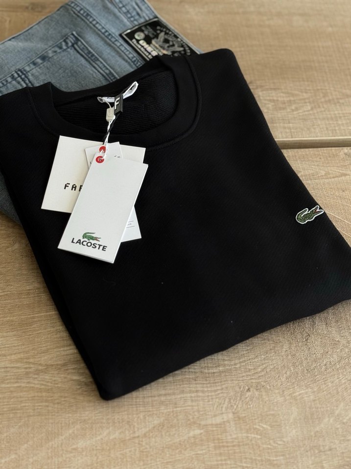 Siyah Lacoste sweatshirt, ve yuvarlak yakalıdır. Pamuklu, rahat kesim ve küçük baskılı logo ile günlük kullanıma uygundur.