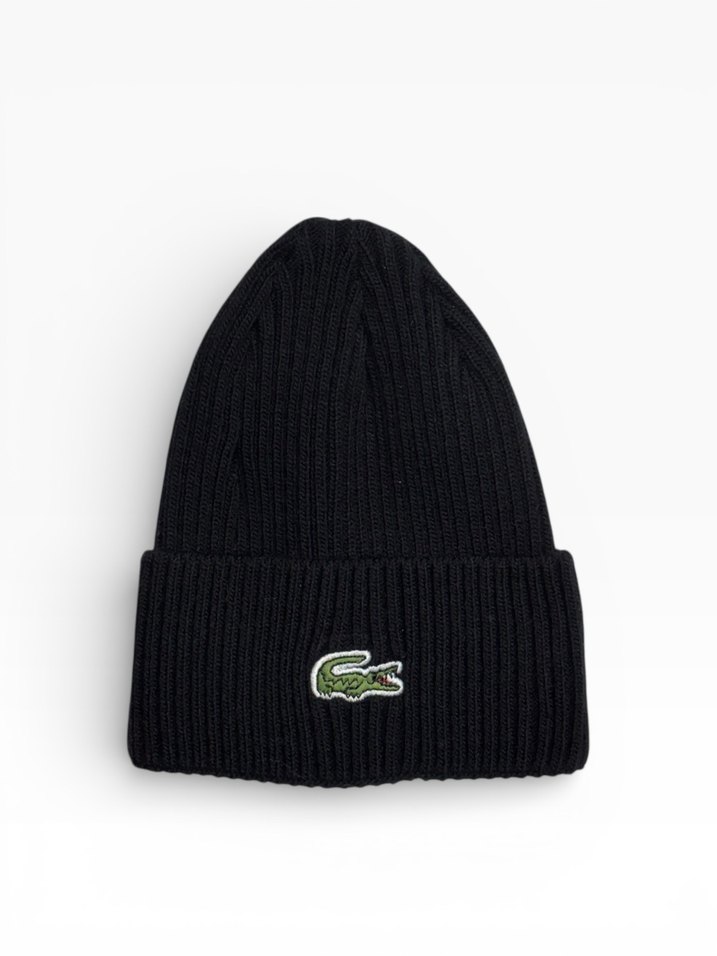 Lacoste markalı siyah örgü kadın bere, yün kumaştan rahat ve sıcak tutar. Sokak stiliyle trend görünümler için uygundur.